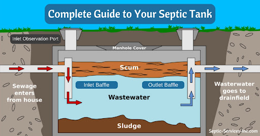 • too much sludge and scum in the tank they just stay behind and build up. The septic tank connects to the house through a main drainage pipe. Once solid waste clogs up these pipes, the drainfield will not.